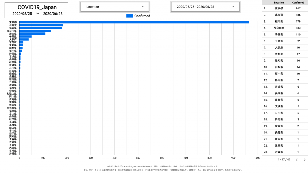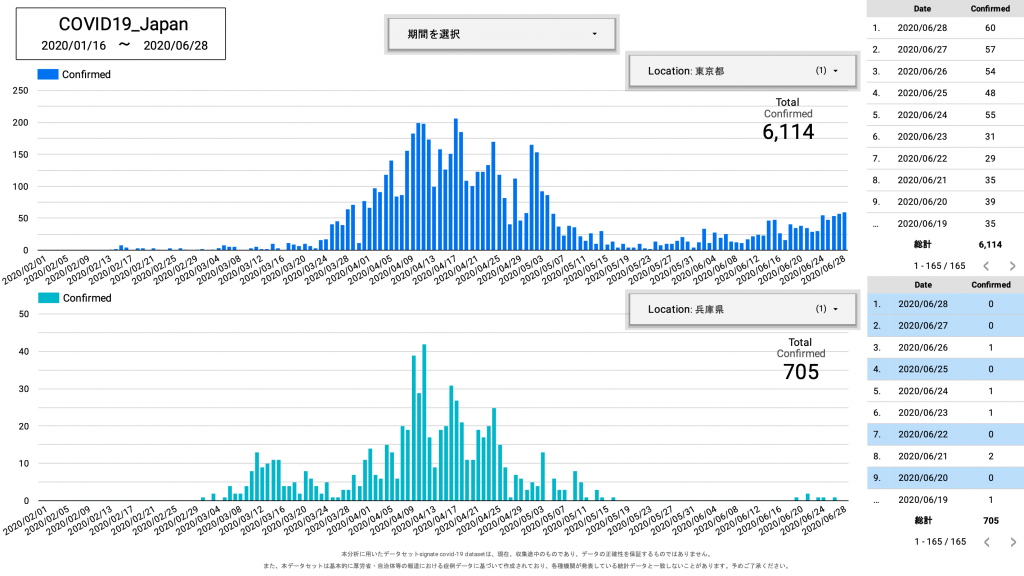 本分析に用いたデータセットsignate covid-19 datasetは、現在、収集途中のものであり、データの正確性を保証するものではありません。また、本データセットは基本的に厚労省・自治体等の報道における症例データに基づいて作成されており、各種機関が発表している統計データと一致しないことがあります。予めご了承ください。