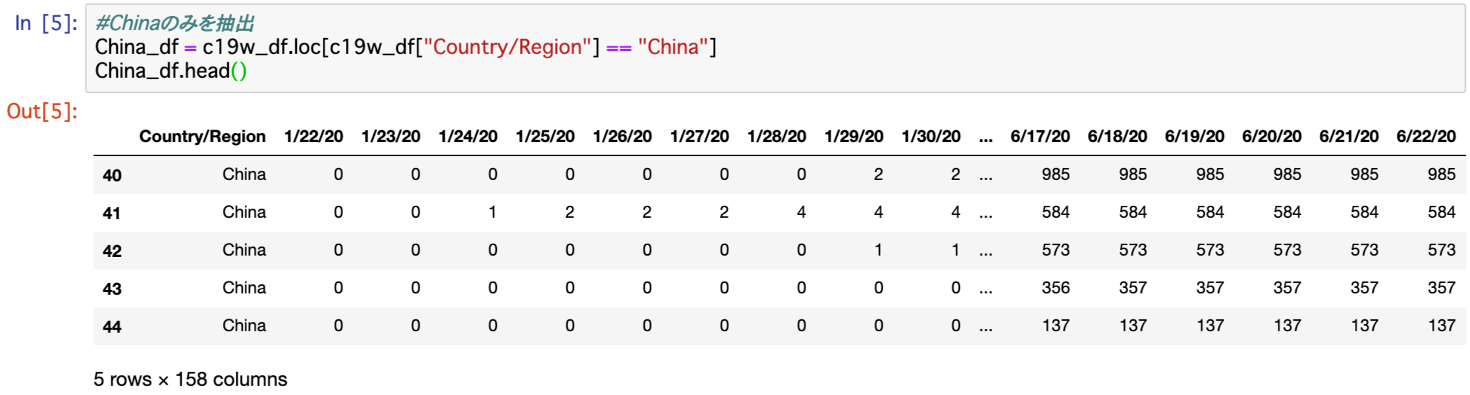 データフレームからChinaのみを抽出し、数字の合計を行います。