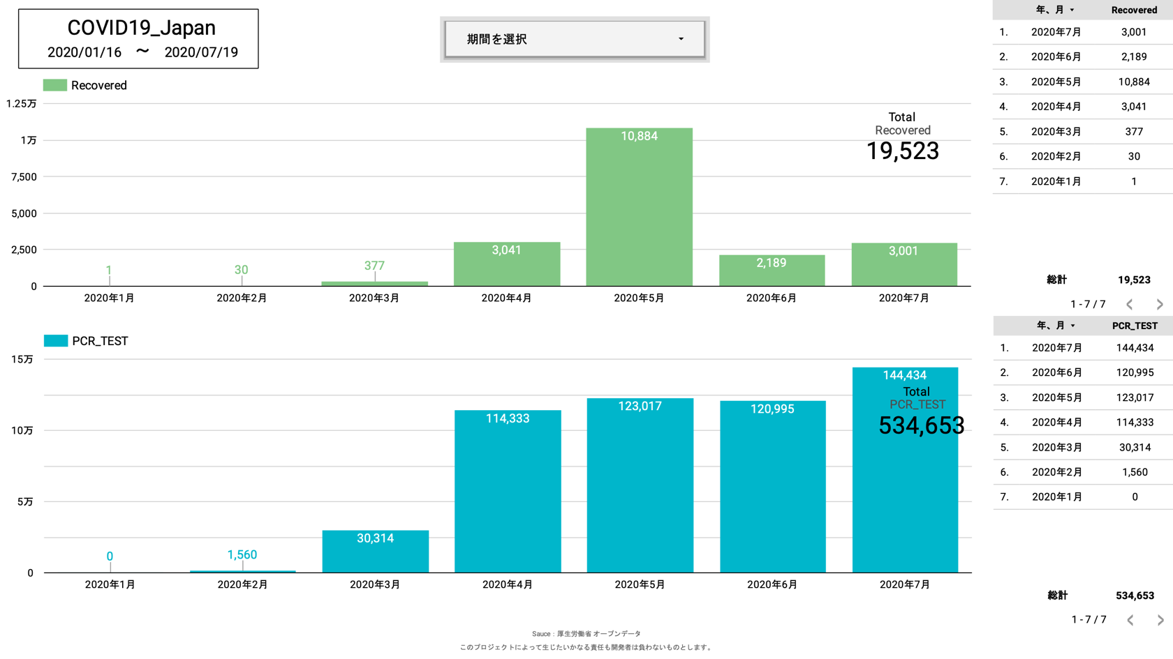 【PythonでCIVID-19分析】日本版(2) CIVID-19状況 2020/07/19時点 投稿者: RandomSeed1973 | 2020年7月26日 0件のコメント 日本感染者数・死亡者数(日別)2020/07/19時点 日本回復者数・PCR検査数(日別)2020/07/19時点 日本感染者数・死亡者数(直近三週間)2020/07/19時点 日本回復者数・PCR検査数(直近三週間)2020/07/19時点 日本感染者数・死亡者数(月別)2020/07/19時点 日本回復者数・PCR検査数(月別)2020/07/19時点