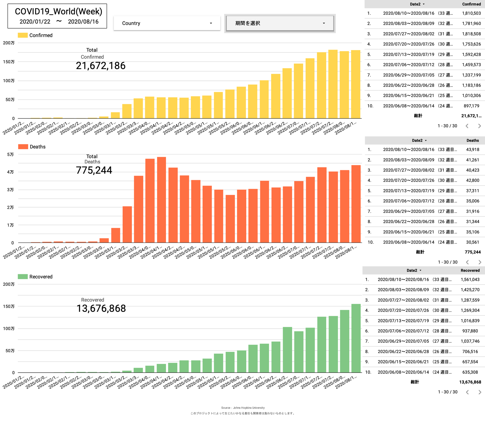 週別のグラフをみると、日本は第二波到来中ですが、世界的に見ると感染者数は断絶なく一貫して増加。