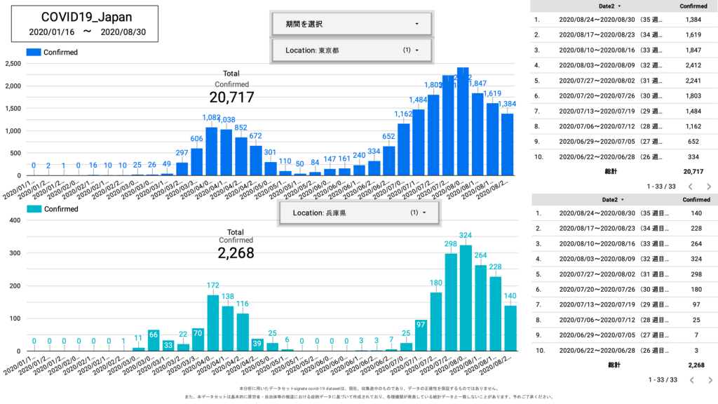 本分析に用いたデータセットsignate covid-19 datasetは、現在、収集途中のものであり、データの正確性を保証するものではありません。また、本データセットは基本的に厚労省・自治体等の報道における症例データに基づいて作成されており、各種機関が発表している統計データと一致しないことがあります。予めご了承ください。