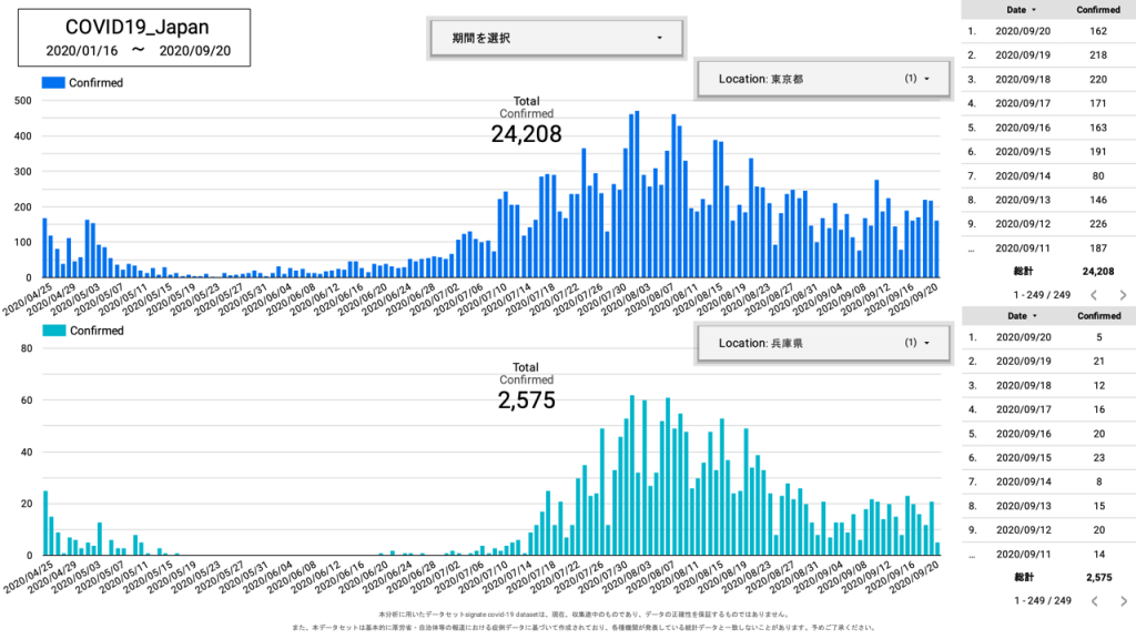 2020/01/16から2020/09/20時点のデータを使って日本のCIVID-19の感染状況を分析してみようと思います。