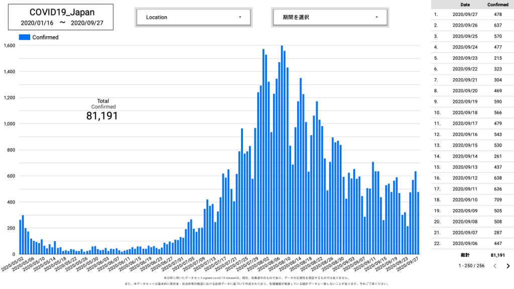 本分析に用いたデータセットsignate covid-19 datasetは、現在、収集途中のものであり、データの正確性を保証するものではありません。また、本データセットは基本的に厚労省・自治体等の報道における症例データに基づいて作成されており、各種機関が発表している統計データと一致しないことがあります。予めご了承ください。