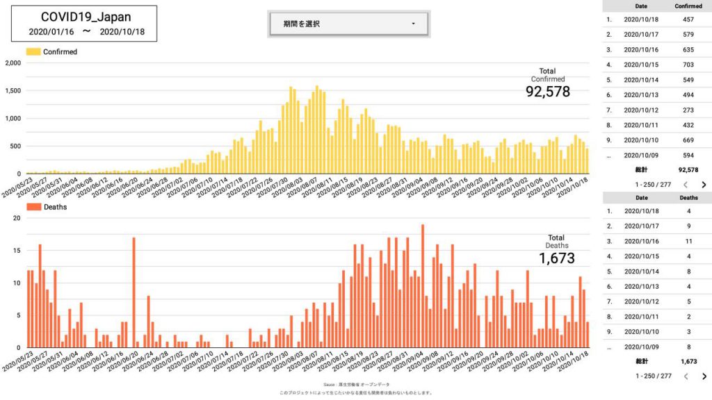 【PythonでCIVID-19分析】日本版(2) CIVID-19状況 2020/10/18時点 投稿者: RandomSeed1973 | 2020年10月20日 0件のコメント 日本感染者数・死亡者数(日別)2020/10/18時点 日本回復者数・PCR検査数(日別)2020/10/18時点 日本感染者数・死亡者数(週別)2020/10/18時点 日本回復者数・PCR検査数(週別)2020/10/18時点 日本感染者数・死亡者数(月別)2020/10/18時点 日本回復者数・PCR検査数(月別)2020/10/18時点