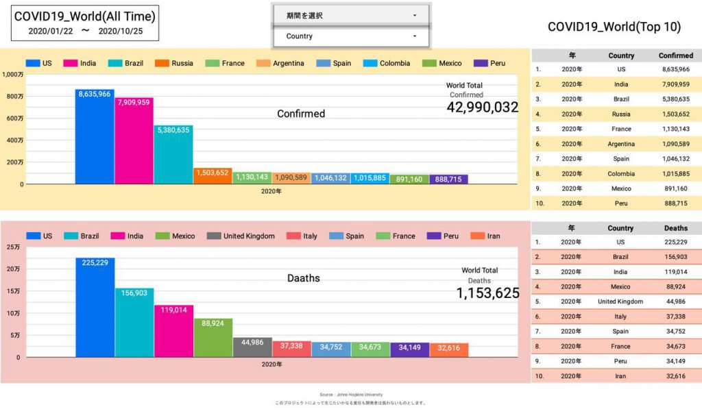 【PythonでCIVID-19分析】世界版 CIVID-19状況 2020/10/25時点 投稿者: RandomSeed1973 | 2020年10月29日 0件のコメント 全世界感染者数・死亡者数 TOP10全期間2020/10/25時点 全世界感染者数・死亡者数 TOP10直近一ヶ月2020/10/25時点 全世界感染者数・死亡者数 TOP10直近一週間2020/10/25時点 全世界日別の累計感染者数2020/10/25時点 全世界週別の累計感染者数2020/10/25時点 全世界月別の累計感染者数2020/10/25時点