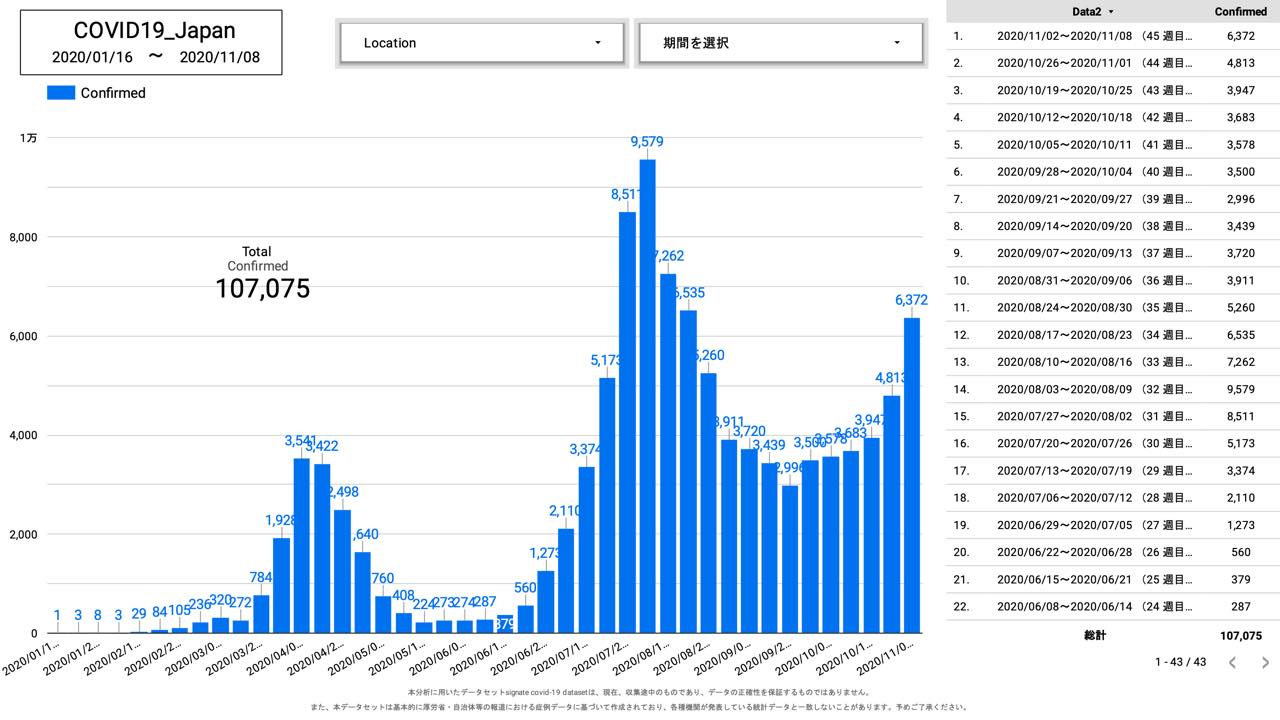 本分析に用いたデータセットsignate covid-19 datasetは、現在、収集途中のものであり、データの正確性を保証するものではありません。また、本データセットは基本的に厚労省・自治体等の報道における症例データに基づいて作成されており、各種機関が発表している統計データと一致しないことがあります。予めご了承ください。