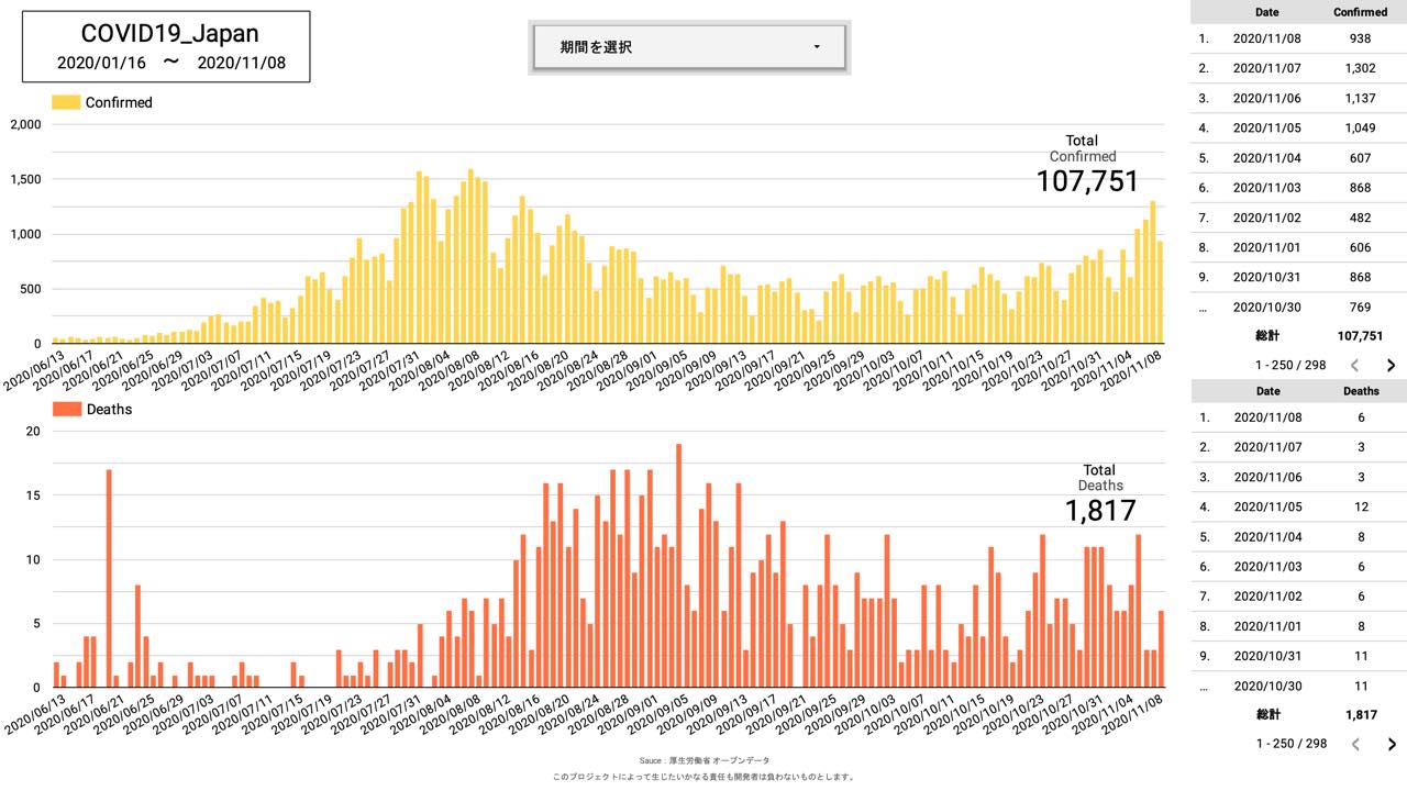 【PythonでCIVID-19分析】日本版(2) CIVID-19状況 2020/11/08時点 投稿者: RandomSeed1973 | 2020年11月10日 0件のコメント 日本感染者数・死亡者数(日別)2020/11/08時点 日本回復者数・PCR検査数(日別)2020/11/08時点 日本感染者数・死亡者数(週別)2020/11/08時点 日本回復者数・PCR検査数(週別)2020/11/08時点 日本感染者数・死亡者数(月別)2020/11/08時点 日本回復者数・PCR検査数(月別)2020/11/08時点