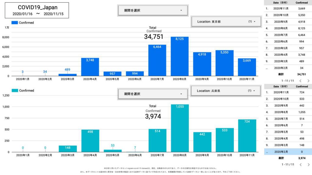 都道府県別の月別累計感染者数(比較:東京都・兵庫県)