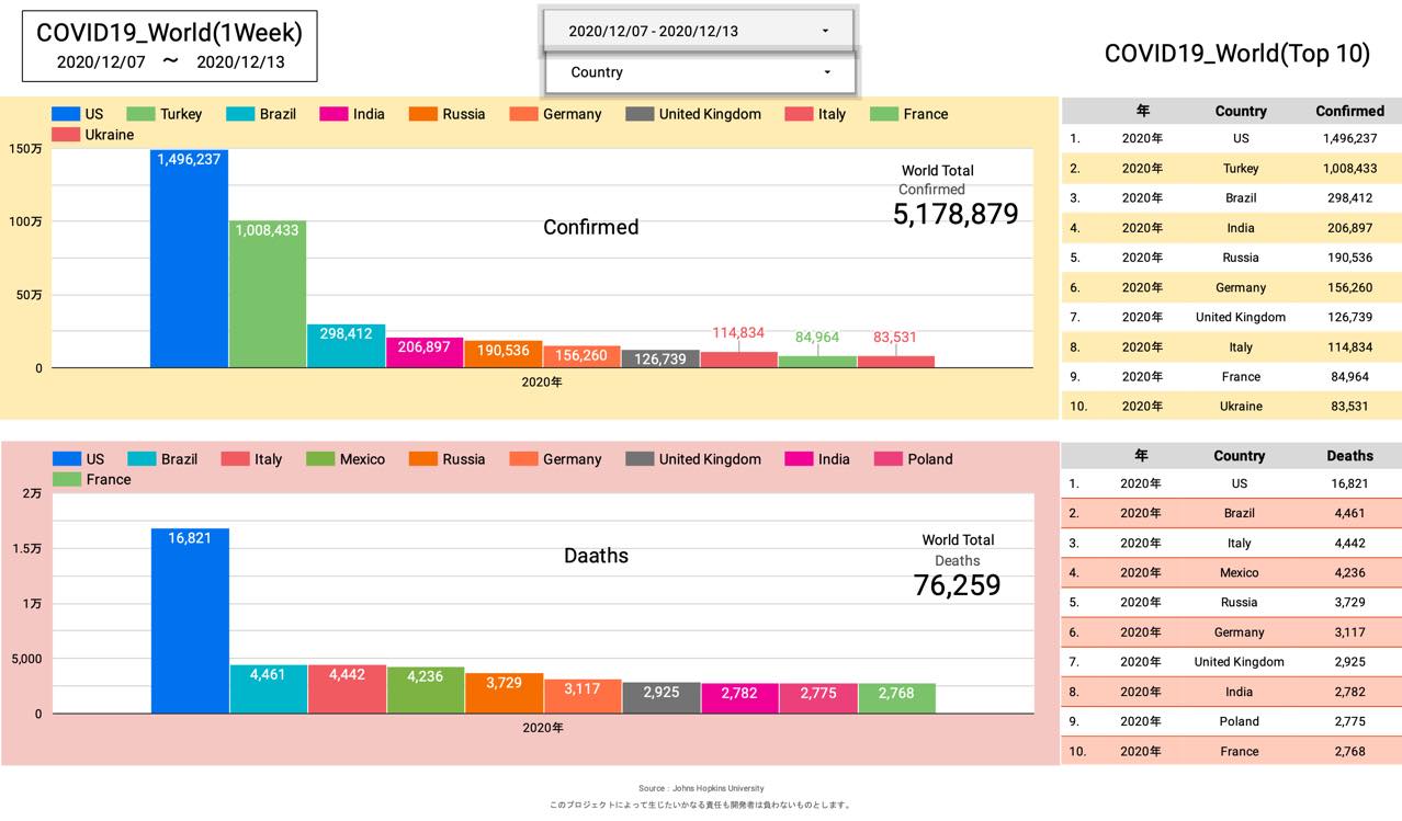 【PythonでCIVID-19分析】世界版 CIVID-19状況 2020/12/13時点 投稿者: RandomSeed1973 | 2020年12月16日 0件のコメント 全世界感染者数・死亡者数 TOP10全期間2020/12/13時点 全世界感染者数・死亡者数 TOP10直近一ヶ月2020/12/13時点 全世界感染者数・死亡者数 TOP10直近一週間2020/12/13時点 全世界日別の累計感染者数2020/12/13時点 全世界週別の累計感染者数2020/12/13時点 全世界月別の累計感染者数2020/12/13時点